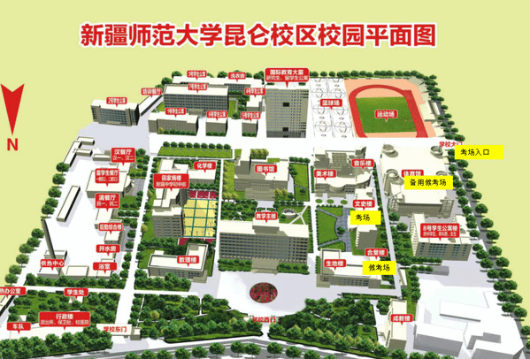新疆师范大学考点(6512)分为两个考区,新疆师范大学昆仑校区文史楼考区和新疆师范大学附属中学考区。考点及考区位置如下图。
