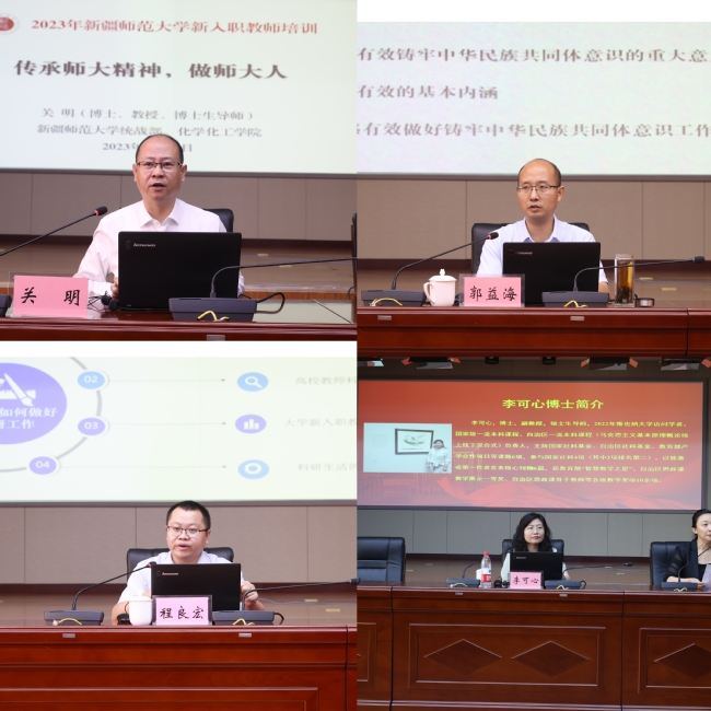 入职教育中,校党委常委、统战部部长关明教授结合自身学习发展经历,以《传承师大精神·做师大人》为题,与新教师分享为人、为师、为学的体会和感悟,激励新教师深耕不辍、担当使命,在为学校事业发展贡献力量的同时,实现“育人育己、成人成己”。自治区党校郭益海教授以《有形有感有效做好铸牢中华民族共同体意识工作》为题,教育引导新教师坚持把立德树人作为中心环节,把思想政治教育工作贯穿教育教学全过程,将铸牢中华民族共同体意识融入教书育人全过程,推动各民族师生广泛交往、全面交流、深度交融。“新师学者”、教育科学学院院长程良宏教授以《诚信为基——新教师如何做好科研工作》为题,结合自身教学科研经历,向新教师阐明高校教师提升科研素养和科研能力的基本路径,在教育教学中培育新时代大学教师的学术责任和精神。我校青年拔尖人才、马克思主义学院李可心副教授以《智慧教学赋能新师育人——基于国家级一流课程设计的思考》为题,以自身主持建设的国家一流课程《马克思主义基本原理概论》为例,解析线上线下融合学习与教学特点、设计原则与方法,阐释信息技术与教学深度融合的路径,鼓励新教师积极参与教学创新并有效融入课程思政。