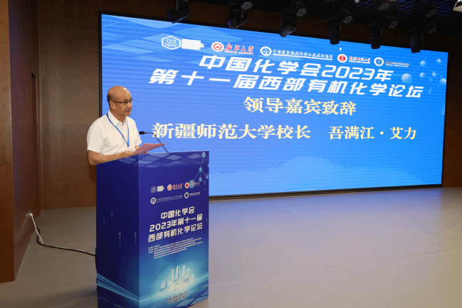 论坛开幕式由我校天山学者特聘教授、延安大学党委副书记、校长高子伟教授主持。自治区党委教育工委副书记张士民、自治区科学技术协会一级巡视员罗福永、石河子大学党委副书记、校长代斌,新疆师范大学党委副书记、校长吾满江·艾力,新疆大学党委常委、副校长刘正江出席大会并致辞。吾满江·艾力在致辞中对论坛的召开表示热烈祝贺,对远道而来的专家学者表示热烈欢迎,并整体介绍了我校办学定位、办学优势和特色以及化学化工学院整体情况,希望各位院士、专家学者更多关心关注新疆师范大学的化学学科建设,通过此次会议能够搭建起更加广泛的学术交流平台,推动西部地区有机化学更多的交流与合作。