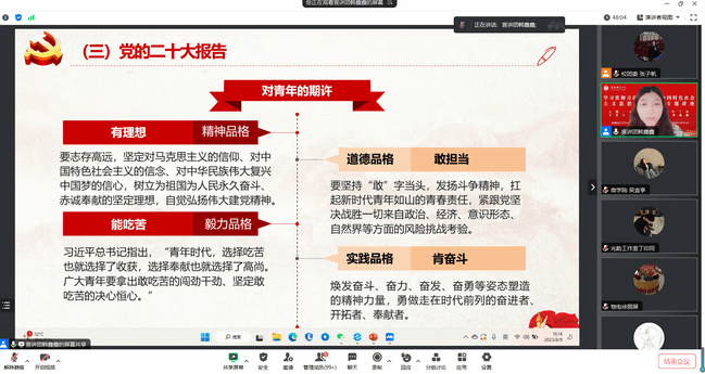 青年学子宣讲团成员、美术学院环境设计20-9班韩鑫鑫从黄文秀同志扶贫先进事迹入手,开展题为《团结奋斗,青年工作》的讲座,生动形象地阐述了党和国家对于青年工作的高度重视,带领大家从习近平总书记对青年的殷殷嘱托和深切寄语中学习感悟习近平总书记关于青年工作的重要思想,引导广大青年学子牢记习近平总书记嘱托,矢志不渝听党话、跟党走,以实现中华民族伟大复兴为己任,不负党和人民的殷切期望,让青春在全面建设社会主义现代化国家的火热实践中绽放绚丽之花。