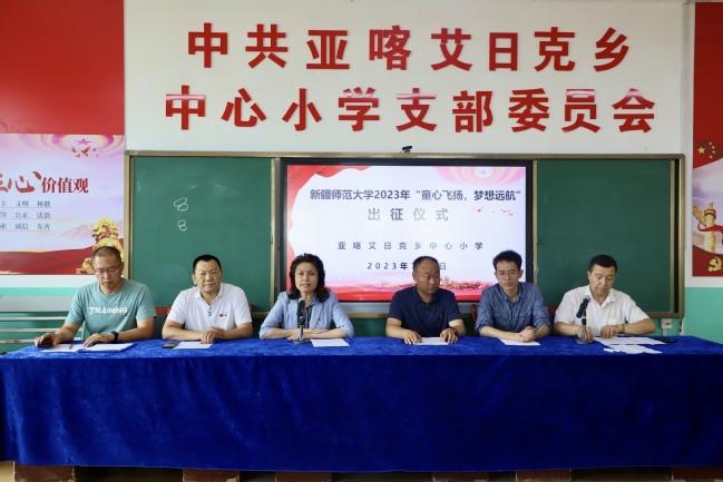 为进一步铸牢中华民族共同体意识,深入推进莎车县亚喀艾日克乡中心小学定点教育帮扶工作走深走实,按照校党委工作部署,我校2023年“童心飞扬 梦想远航”夏令营出征仪式于7月7日在亚喀艾日克乡中心小学举行。我校党委常委、副校长、驻莎车县前方党工委书记帕力旦·吐尔逊,亚喀艾日克乡党委书记梁秀超,乡中心小学党支部书记马建刚,校长吐尔洪江·吐尔孙出席了出征仪式。