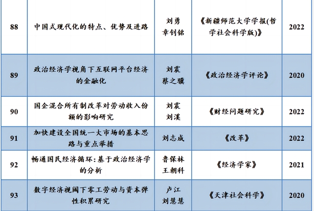 近日,武汉大学《中国政治经济学学术影响力评价报告(2020-2022)》课题组发布了“2020年1月1日至2022年12月31日之间中国政治经济学最具影响力的200篇学术论文”,原刊于《新疆师范大学学报(哲学社会科学版)》,刘勇、章钊铭撰写的《中国式现代化的特点、优势及进路》位列其中。