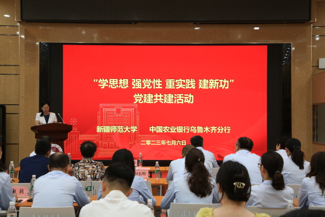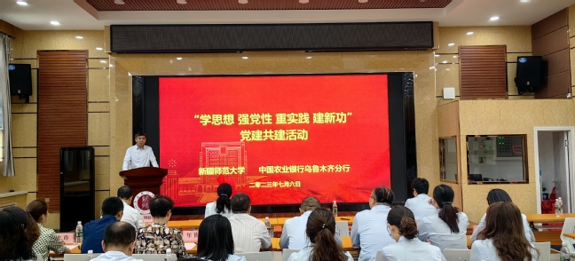 为深入推动学习贯彻习近平新时代中国特色社会主义思想主题教育走深走实,7月6日上午,我校与中国农业银行乌鲁木齐分行开展“学思想、强党性、重实践、建新功”党建共建活动。校党委常委、纪委书记蒋方珍,校党委常委、组织部部长胡毅涛,中国农业银行新疆分行党委委员、乌鲁木齐分行党委书记、行长桑斌出席活动,学校相关部门负责人、学院专职组织员,中国农业银行乌鲁木齐分行相关部门负责人及工作人员60余人参加活动。活动由校党委常委、组织部部长胡毅涛主持。
