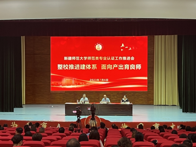 7月6日上午,我校2023年师范类专业认证工作推进会在温泉校区昆仑讲堂召开。会议邀请教育部师范类专业认证专家委员会委员、学术委员会主任宋冬生教授就“整校推进建体系,面向产出育良师”为主题进行了讲座。校党委副书记、校长吾满江·艾力出席并讲话,各相关职能部门领导、学院领导、专业负责人、教研室主任、核心课程骨干教师代表等200余人现场聆听了讲座。会议由教务处处长、教学质量监测与评估中心主任路俊哲主持。