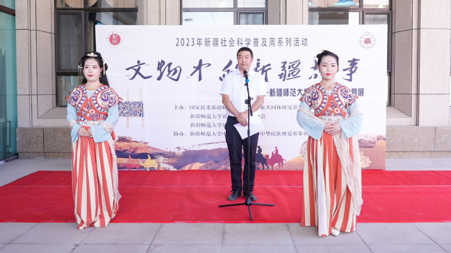 7月3日下午,2023年新疆社会科学普及周系列活动之“文物中的新疆故事”新疆师范大学社科普及展开幕式在我校温泉校区笃学楼一楼举行。自治区社会科学界联合会主要领导、自治区民委(宗教事务局)领导、自治区党委统战部领导等参加了开幕式,新疆师范大学主要领导及部分学院教师和学生代表出席开幕式。新疆师范大学党委常委、统战部部长关明主持开幕式。