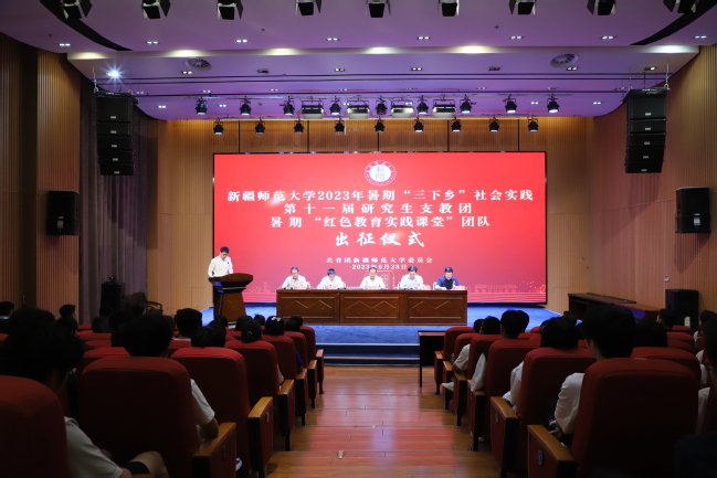 6月28日上午,我校2023年暑期“三下乡”社会实践、第十一届研究生支教团暨暑期“红色教育实践课堂”出征仪式在温泉校区后勤二楼学术报告厅举行。校党委副书记刘俊,党委常委、宣传部部长高靖,马克思主义学院党委书记张峥,学生工作部(处)副处长赵直,学生就业指导办公室副主任吐尔逊·达吾提以及校团委负责同志、部分学院团委书记以及暑期社会实践团代表参加本次活动。