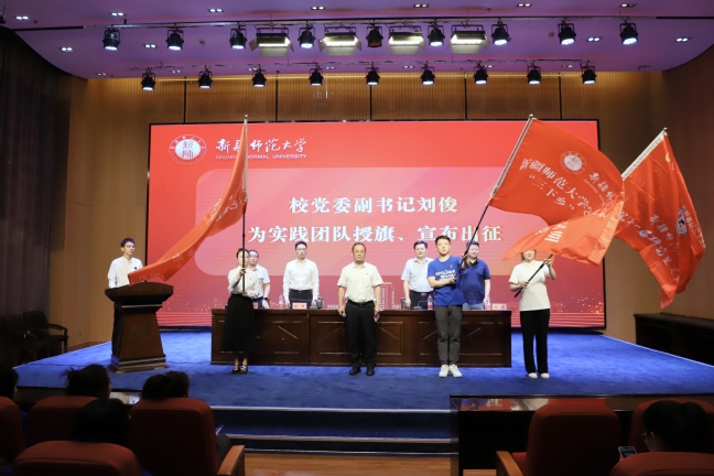 会上,刘俊向社会实践团队代表授旗并宣布我校2023年暑期社会实践正式启动。高靖作动员讲话,代表校党委向所有参加暑期社会实践的师生表示亲切的问候和良好的祝愿。他回顾了我校在社会实践方面取得的丰硕成果并对今年暑期社会实践提出四点希望:一是希望同学们通过参加暑期社会实践活动用心感受十八大以来国家的巨大成就,进一步了解国情、民情,坚定“四个自信”,增强“四个意识”,用实际行动报效祖国;二是希望同学们深入学习宣传党和国家方针政策,铸牢中华民族共同体意识;三是希望同学们发挥所长,把所学知识转化为服务人民、服务社会的具体实践,提高解决实际问题的能力;四是希望同学们在实践中培养团队协作精神,养成吃苦耐劳的优良品质和注重实践、真抓实干的良好作风。高靖要求,广大新师学子要坚守理想、践行初心,积极投身实践、勇担时代责任,为实现中华民族伟大复兴持续贡献青春力量。
