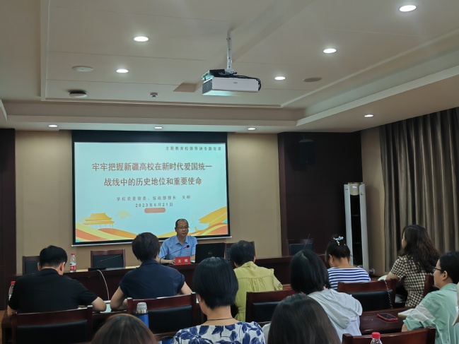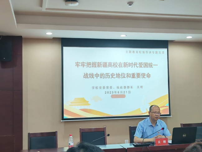 关明结合此次主题教育理论学习和实践调研成果,以及分管领域的工作实际,从统战工作的内涵、统战工作的历史与发展、高校在统战工作中的历史地位和重要使命、新疆高校如何在新时代统战工作中践行使命发挥作用等四个方面,解读了新时代统战工作的重大意义和丰富内涵。讲授中,关明紧密结合近年来我校统战工作开展情况和取得的成效,以具体实事为例,充分展示了统战工作在学校改革发展稳定事业中所发挥的重要推动作用和积极影响。关明强调,希望大家要深刻把握统战工作的核心要义,全身心投入到教学科研和学科专业建设等工作中去,凝心聚力、共谋发展,为更好推动学校各项事业发展作出应有的贡献。