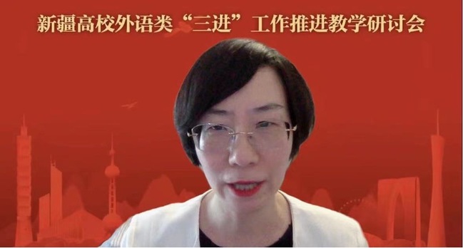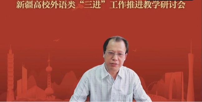 为推进学习贯彻习近平新时代中国特色社会主义思想主题教育走深走实,深入落实《习近平谈治国理政》多语种版本进高校进教材进课堂“三进”工作,促进新疆高校外语院系扎实开展外语教学改革与学术研究,推动“理解当代中国”课程建设成果共建共享,进而提升我区外语学科发展竞争力,培养堪当民族复兴大任的高素质外语⼈才,6月17日新疆高校外语类“三进”工作推进教学研讨会在我校举办。本次会议由新疆维吾尔自治区教育厅指导,新疆高校外语教学研究会主办,新疆师范大学外国语学院承办,外语教学与研究出版社协办。