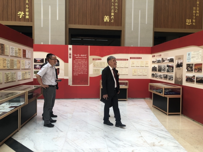 习近平总书记指出:“档案工作存史资政育人,是一项利国利民,惠及千秋万代的崇高事业。”为深入贯彻党的二十大精神,推动学习贯彻习近平新时代中国特色社会主义思想主题教育走深走实,促进学校档案工作高质量发展,在2023年第十六个国际档案日来临之际,由学校主办,党委办公室、学校办公室承办,团委协办的“兰台翰墨 桃李芬芳——‘6·9’国际档案日档案育人主题展览”在温泉校区图书馆二楼开展。开展当日,校党委常委、统战部部长关明陪同正在我校交流的吉尔吉斯斯坦奥什国立大学校长科卓别科夫·库达伊别尔迪参展。