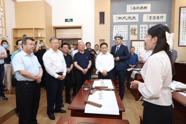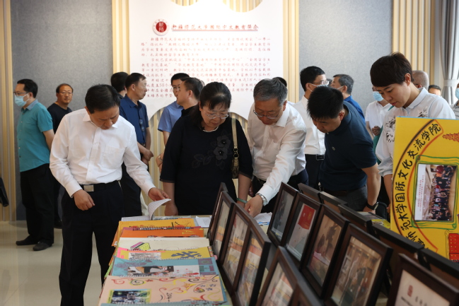 调研组一行首先来到我校中华优秀传统文化体验基地,观摩孔子学院成果展。塔吉克斯坦民族大学孔子学院原中方院长贾静芳介绍了我校合作共建三所孔子学院的特色以及取得的成果。接着,领导们参观了留学生教育展示厅,了解了我校留学生教育的历史发展脉络。
