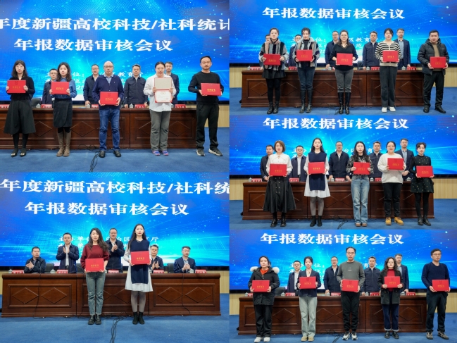 吕小毅宣读了《新疆维吾尔自治区高等学校科研管理研究会关于表彰新疆高校科技/社科统计先进标兵、先进个人和优秀会务组织单位的决定》,共有5名教师获评先进标兵、15名教师获评先进个人、2家单位获评优秀会务组织单位。我校社会科学处获评优秀会务组织单位。与会领导为获奖教师颁奖并合影留念。