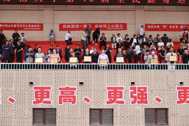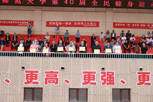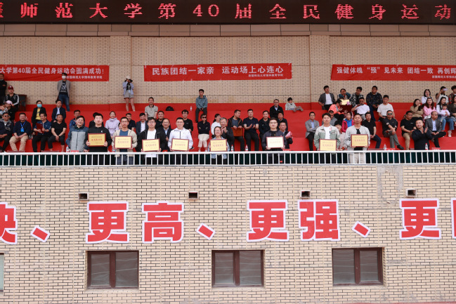 经过两天的激烈角逐,新疆师范大学第40届全民健身运动会顺利完成各项预定赛程,于5月20日下午在温泉校区运动场圆满落幕。校党委书记葛国,校党委副书记王志勇,校党委副书记刘俊,校党委常委、副校长季荣,校党委常委、纪委书记蒋方珍,校党委常委、宣传部部长高靖,校党委常委、组织部部长胡毅涛出席闭幕式并为获奖集体代表颁奖。校党委常委、副校长陈彤主持闭幕式。各学院和有关部门负责人、各学院师生代表参加了闭幕式。