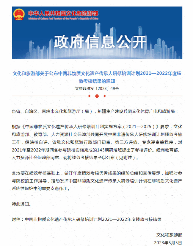 此次绩效考核由文化和旅游部、教育部、人力资源和社会保障部共同开展。经院校自评、省级文化和旅游行政部门初审、第三方评估、专家评审等程序,对2021年至2022年期间各参与院校实施完成的143期研修培训班进行考核评价,我校美术学院喜获佳绩。