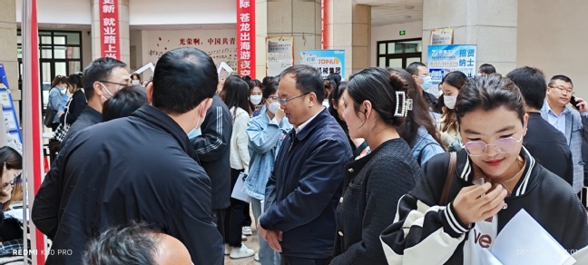 校党委副书记刘俊来到双选会现场,向用人单位推介毕业生并与用人单位招聘负责人沟通交流,助力毕业生和用人单位实现精准对接,把合适的岗位送到合适的人才身边。同时与现场毕业生进行交流,仔细了解其就业意向和应聘情况等,鼓励毕业生充满信心,精准定位,展示优势,提升与用人单位岗位的匹配度,积极就业、主动就业。