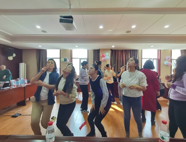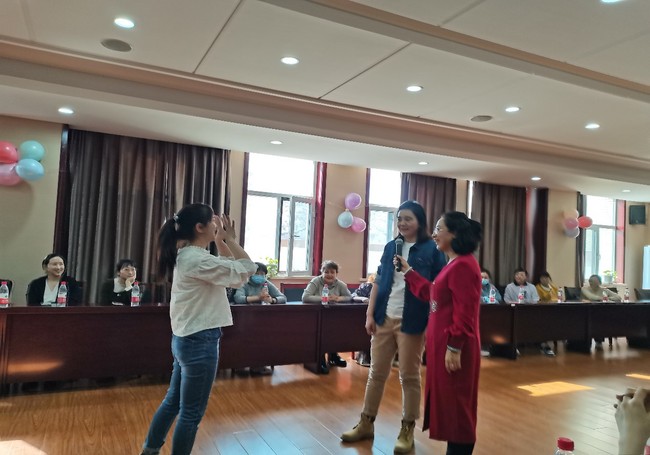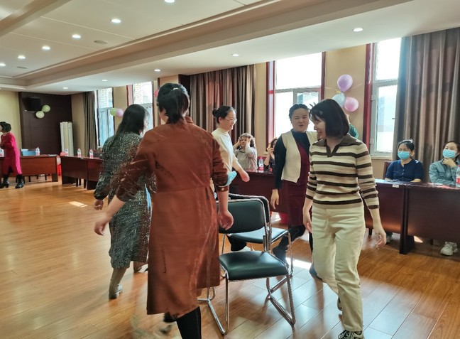 活动第一项为游戏环节,共设有“抢凳子”“你来比划我来猜”“筷递纸杯”“两人三足接力”“猜歌名”“双龙戏珠”六组游戏。女干部们以热情饱满的姿态投入游戏。传统游戏“抢凳子”是大家耳熟能详的游戏,五名游戏者围着三把凳子,伴随音乐的律动转圈,当音乐暂停时,大家忙作一团抢凳子坐,一时间笑声不绝于耳,游戏气氛融洽而热烈。“你来比划我来猜”只能采用肢体语言进行提示,难度较大,但老师们兴趣盎然,许多四字成语在大家搞笑夸张的动作下展现地栩栩如生,现场掌声、笑声不断。“筷递纸杯”游戏充分展现了合作和智慧。随着主持人的一声令下,大家就开始忙活起来,蹲下、起身、找平衡、小心翼翼的用口中的筷子运送纸杯,眼疾手快而又神色自若。观战的老师在一旁不停地指导加油,用手机抓拍下精彩瞬间。“猜歌名”环节中每一首歌曲的音符落下,都让大家重拾青葱岁月,每一句歌词都透露青春的情怀,让人意犹未尽。昂扬向上的拼搏精神,团结一致的团队意识在“两人三足接力”和“双龙戏珠”游戏中被表现地淋漓尽致。比赛过程紧张激烈又妙趣横生,现场热闹非凡、气氛活跃。