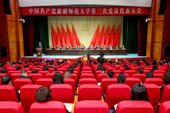 昆仑讲堂现场气氛庄重而热烈。主席台正上方,悬挂着“中国共产党新疆师范大学第三次党员代表大会”的会标。后幕正中,金色的中国共产党党徽在两侧十面鲜艳的红旗簇拥下显得格外醒目。会场两侧,悬挂着“聚焦立德树人,建设一流师范”的标语。主席台下,代表们有序就坐,神情振奋,胸前的党员徽章熠熠生辉。