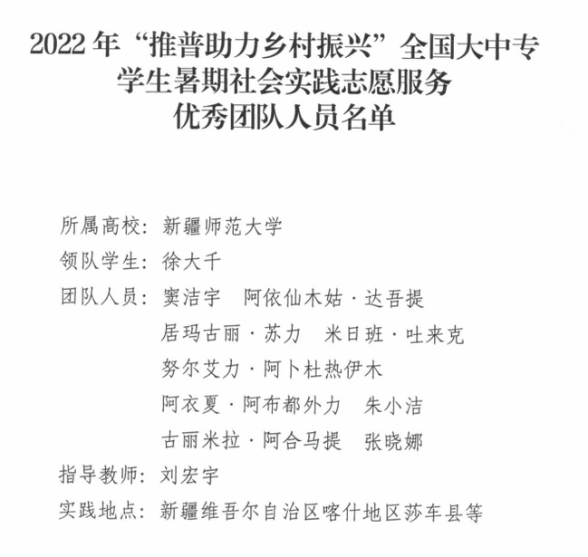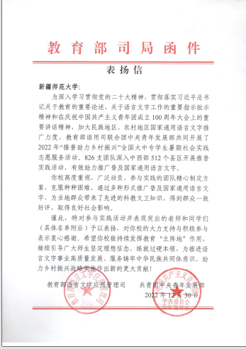 近日,教育部语言文字应用管理司和共青团中央青年发展部对我校志愿团队的工作给予高度肯定,授予“推普助力乡村振兴”全国大中专学生暑期社会实践志愿服务优秀团队,并对团队指导教师中国语言文学学院院长刘宏宇教授、领队2021级语言学及应用语言学专业博士研究生徐大千以及志愿者团队成员给予表扬。