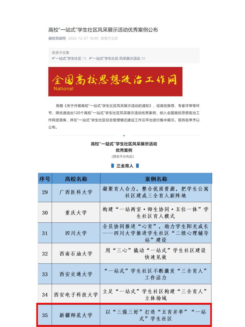 12月27日,经高校推荐、专家评审等环节,教育部共择优遴选出120个高校“一站式”学生社区风采展示活动优秀案例。我校以“三强班级”“三好宿舍”创建为载体探索“一站式”学生社区综合管理模式建设,并根据通知要求进一步总结经验、凝练成果,最终推荐的活动成果《以“三强三好”打造“五育并举”“一站式”学生社区》喜获教育部高校“一站式”学生社区风采展示活动“三全育人”类优秀案例,纳入全国高校思想政治工作网资源库,同时在“一站式”学生社区综合管理模式建设工作云平台进行集中展示。