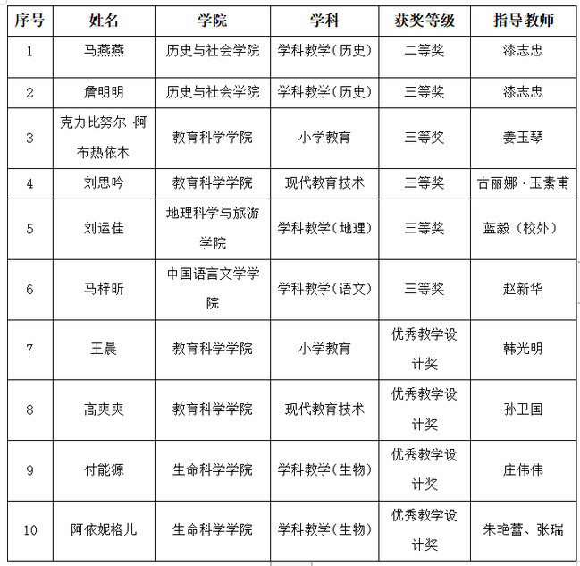 “田家炳杯”全日制教育硕士专业学位研究生教学技能大赛是一项全国性高水平赛事,旨在加强教育硕士专业学位研究生教育教学实践能力的培养,促进培养院校之间的相互交流,不断提高教育硕士专业学位研究生的培养质量。自赛事启动以来,学校高度重视、积极动员、精心组织各学院组建参赛队伍,通过前期校内预赛选拔及专题辅导等方式,反复打磨参赛选手的教学设计,不断完善教学实施过程。最终在全国决赛中,来自历史与社会学院的马燕燕获得学科教学(历史)组二等奖,教育科学学院刘思吟、克力比努尔·阿布热依木,历史与社会学院詹明明,中国语言文学学院马梓昕和地理科学与旅游学院刘运佳分获现代教育技术组、小学教育组、学科教学(历史)组、学科教学(语文)组和学科教学(地理)组三等奖,教育科学学院高爽爽、王晨和生命科学学院付能源、阿依妮格儿四位同学获得现代教育技术组和学科教学(生物)组优秀教学设计奖。