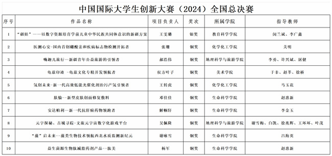 近日,全国大学生创业服务网发布《关于公示中国国际大学生创新大赛(2024)总决赛有关赛事获奖名单的通知》,大赛组委会公布了本届大赛国赛的金银铜奖项获奖名单,我校在此次比赛中荣获国家银奖1项、铜奖9项。