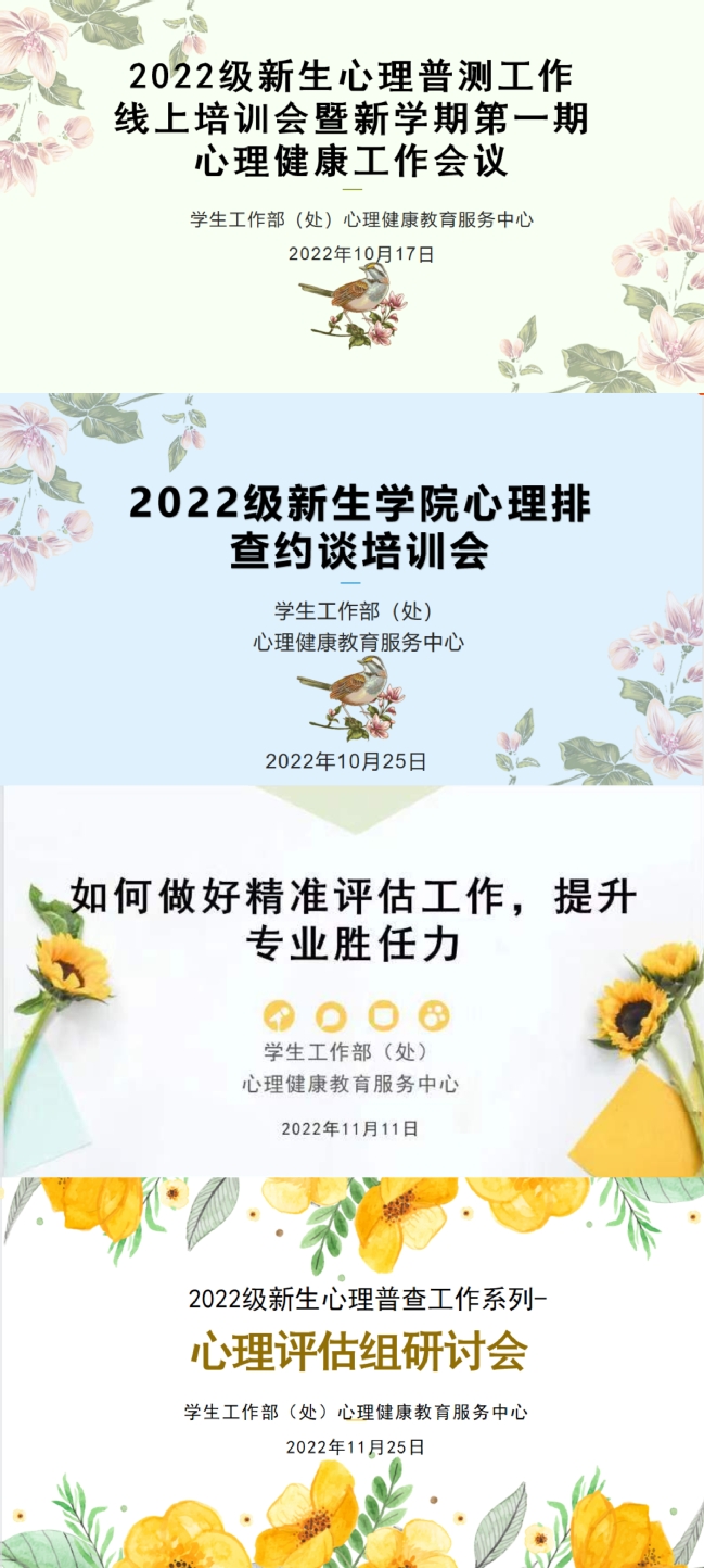 为保证此次心理健康普查工作顺利进行,学校心理健康教育服务中心专门安排了“2022级新生心理普测工作线上培训会暨新学期第一期心理健康工作会议”“2022级新生学院心理排查约谈培训会”及“如何做好精准评估工作,提升专业胜任力”三场线上培训,就心理普查操作流程、注意事项等内容进行讲解,从约谈内容、专业评估等方面为各学院本科生心理辅导专干和研究生辅导员进行专业指导。在2022级新生心理评估工作结束后,心理健康教育服务中心组织心理咨询师召开“心理评估组”研讨会,讨论当前2022级心理风险学生中存在的心理困扰,并从危机因素和保护因素角度分析学生心理稳定的原因并对后续工作提出宝贵建议。