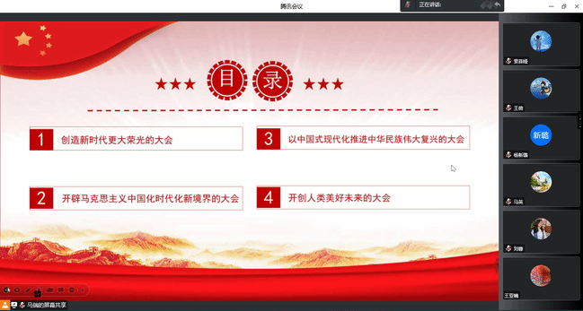 根据学校党委工作安排,12月23日下午马克思主义学院承办的校内师生巡讲团学习宣传贯彻中国共产党第二十次全国代表大会精神专题学习进学院、进班级集中领学活动之《深刻领会党的二十大召开的重要意义》主题宣讲以线上方式举行,由马克思主义学院副教授陶晶主讲。宣讲会由马克思主义学院党委书记张峥主持,马克思主义学院、商学院、政法学院、历史与社会学院、教育科学学院、中国语言文学学院、外国语学院全体教师参与学习。