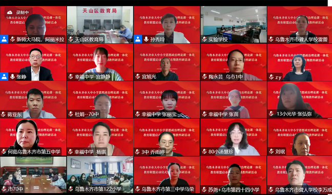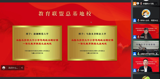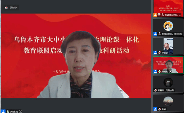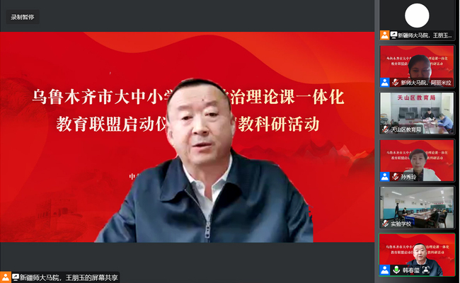 为深入贯彻落实习近平总书记关于办好思政课相关重要指示批示精神,贯彻落实《关于深化新时代学校思想政治理论课改革创新的若干意见》等文件要求,坚持不懈用习近平新时代中国特色社会主义思想铸魂育人,推进大中小学思政课一体化建设,由乌鲁木齐市委教育工委、市教育局、新疆师范大学马克思主义学院、乌鲁木齐职业大学马克思主义学院及全市48所中小学幼儿园共同组建了乌鲁木齐市大中小学思想政治理论课一体化教育联盟。12月7日下午,联盟启动仪式暨首期教科研活动以线上会议方式举行。自治区人民政府督学、自治区教育厅一级巡视员韩春玺出席启动仪式并讲话。新疆师范大学党委常委、副校长、马克思主义学院院长孙秀玲,乌鲁木齐职业大学党委委员、副校长李润芝,乌鲁木齐市委教育工委副书记、教育局党组书记张瑛分别致辞。来自乌鲁木齐教育系统600余名思政工作者、教师参加仪式。仪式由新疆师范大学马克思主义学院党委书记张峥主持。