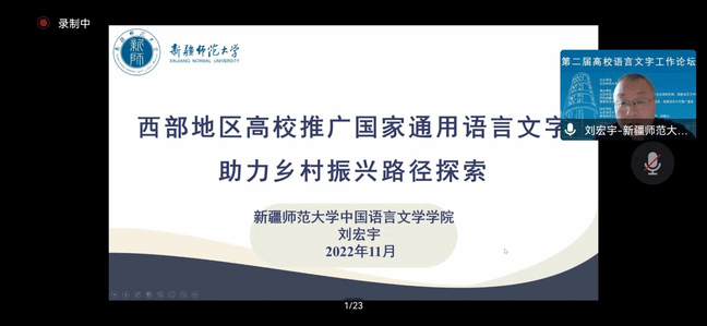 我校国家语言文字推广基地执行主任、中国语言文学学院院长刘宏宇教授在第二分论坛作了《西部地区高校推广国家通用语言文字助力乡村振兴路径探索》专题报告。报告高度概述了学校深度整合教学、科研、管理、培训资源,在高校人才培养、国家通用语言文字研究、助力南疆语言文字推广、服务乡村振兴、繁荣乡村语言文化等重要领域取得的成就。