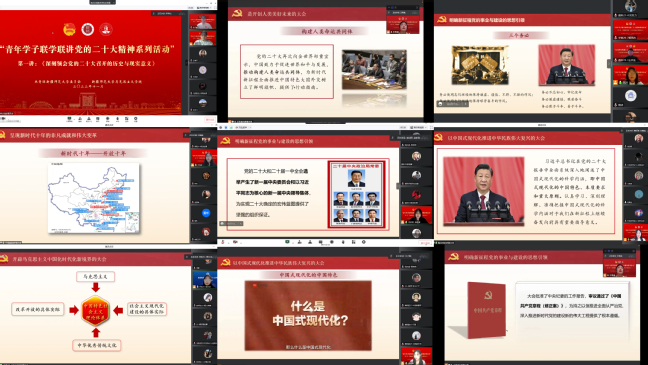 为深入学习宣传贯彻党的二十大精神,充分发挥朋辈榜样的示范引领作用,做好党的二十大精神的青年化阐释,团结引领我校广大青年学子切实把思想和行动统一到党的二十大精神上来,把智慧和力量凝聚到党的二十大确定的各项任务上来,激发广大青年向第二个百年奋斗目标奋勇前进,11月30日晚,由校团委和马克思主义学院共同组建的“党的二十大青年宣讲团”走进各学院、各班级团支部,通过腾讯会议直播、钉钉班群转播的形式开展了《深刻领会党的二十大召开的历史与现实意义》专题宣讲。活动覆盖全校20个学院、823个团支部、19000余名团员青年。