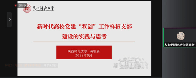陕西师范大学党委学生工作部(武装部、学生处)部(处)长蒋毓新作了题为《新时代高校党建“双创”工作样板支部建设的实践与思考》的专题讲座,以生动丰富的实践案例,具体介绍了机关党支部如何防止“灯下黑”,不断推动党建业务相互融合的新思路、新方法。
