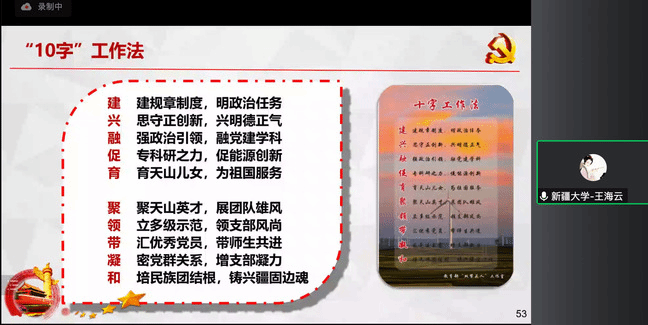 新疆大学电气工程学院电气系党支部书记王海云以《党建与学科建设双促双融的实践与探索》为题,全面介绍和呈现了党支部在争创全国教师党支部书记“双带头人”工作室过程实施的“10”字工作法经验和体会。