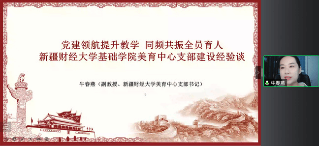 新疆财经大学基础学院美育中心党支部书记牛春燕以《党建领航提升教学,同频共振全员育人》为题,从发挥党支部战斗堡垒作用、提升党建质量、党建与业务相融合、实践与创新四个方面,介绍了在争创全国第三批“双带头人”教师党支部书记工作室过程中的工作思路和实践经验。