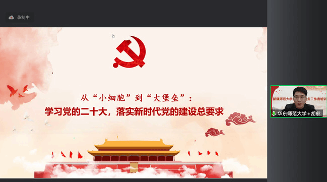 华东师范大学教育学部本科生联合党支部书记胡航以《深入学习二十大,落实新时代党的建设总要求》为题,具体介绍了支部以党小组为抓手,创新实施“朋辈引领计划”,通过“1+2”工作模式,将党支部做到从“小细胞”到“大堡垒”的思考与体会。
