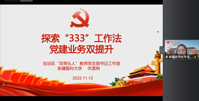 新疆医科大学基础医学院病理生理学党支部书记巩雪俐以《探索“333”工作法 党建业务双提升》为题,重点介绍了病理生理学党支部在争创自治区“双带头人”教师党支部书记工作室的经验做法,分享了通过探索“333”工作法,促进党建业务双提升的具体成效。