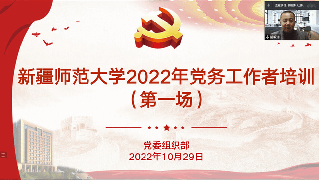 为深入学习贯彻党的二十大精神,进一步提升学校基层党务工作者党建业务工作水平,推动基层党组织全面进步、全面过硬,按照学校党委安排部署,10月29日至11月12日,我校举办了2022年度秋季学期党务工作者培训班。此次培训共分三场,采取线上形式进行。各二级党组织书记、副书记、党支部书记、组织员及部分新疆天山职业技术大学党务工作者等300余人参加会议。校党委常委、组织部部长胡毅涛出席会议并讲话。