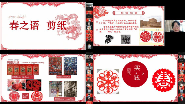 仪式上,我校国际文化交流学院张婷燕老师为大家带来了精彩的第一堂课——“中华剪纸艺术”,课程详细介绍了剪纸的历史渊源、艺术特色及制作技巧,通过生动的讲解和细致的演示,营员手中的剪刀在彩纸上轻盈飞舞,一个个“春”字活跃地展现在各自的屏幕上。