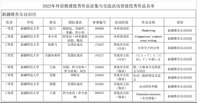 8月31日,全国高校外语微课大赛新疆赛区赛暨2022年高等学校外语微课优秀作品征集与交流活动经由主办方新疆高校外语教学研究会完成评审并进行省级优秀作品名单公示。新疆20所高校的105个优秀微课作品入围本次大赛,我校外国语学院推荐的11个作品全部进入终评。经过专家组评审,最终外国语学院教师团队作品获得自治区一等奖2项、二等奖3项、三等奖3项,其中一等奖作品晋级全国决赛。