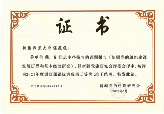 我校政法学院教师魏勇主持撰写的课题报告《新疆党的组织建设发展历程和基层经验研究》被评为2021年度调研课题优秀成果三等奖