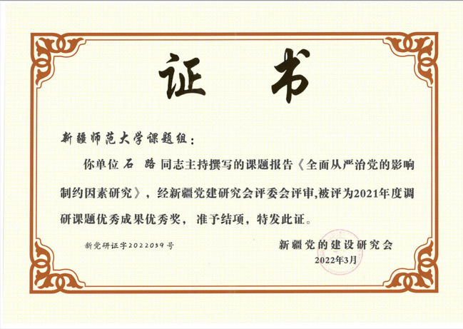 我校政法学院教师魏勇主持撰写的课题报告《新疆党的组织建设发展历程和基层经验研究》被评为2021年度调研课题优秀成果三等奖;政法学院教师石路主持撰写的课题报告《全面从严治党的影响制约因素研究》被评为2021年度调研课题优秀成果优秀奖。