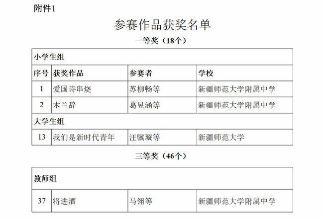 8月14日至18日,第四届中华经典诵写讲大赛新疆赛区“诵读中国”经典诵读大赛经由主办方新疆维吾尔自治区教育厅完成评审并进行获奖名单公示。本次大赛经全区各地各高校申报、各级教育行政部门逐级审核、自治区教育厅组织专家评审,在千余件作品中评选出获奖作品150件、“优秀指导教师奖”78个、优秀组织奖14个。我校经前期组织校级比赛和评选,报送诵读作品115件,最终获一等奖3项、三等奖1项,5人获“优秀指导教师奖”,学校获“优秀组织奖”。