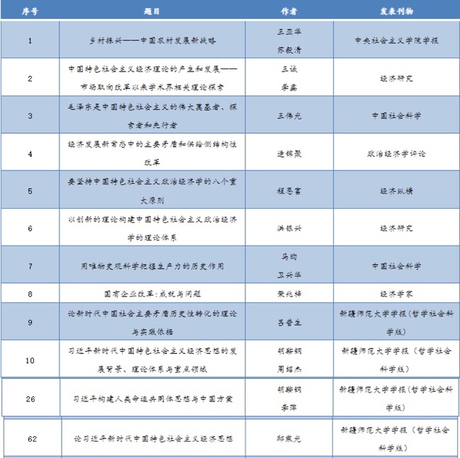 近日,《中国政治经济学学术影响力评价报告.2020》遴选出“中国政治经济学最具影响力的300篇学术论文(2012-2019),《新疆师范大学学报(哲学社会科学版)》共有《习近平构建人类命运共同体思想与中国方案》《论习近平新时代中国特色社会主义经济思想》等四篇文章入选。其中,由吕普生撰写的《论新时代中国社会主要矛盾历史性转化的理论与实践依据》以及胡鞍钢、周绍杰撰写的《习近平新时代中国特色社会主义经济思想的发展背景、理论体系与重点领域》位列前十名。
