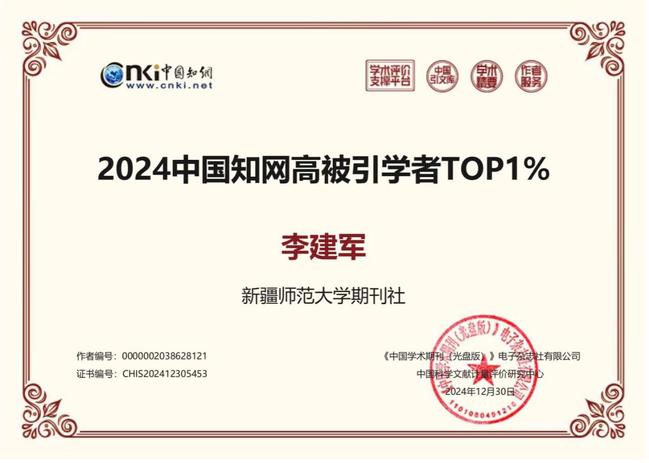 2024年,中国知网中国科学文献计量评价研究中心(简称“知网评价中心”)基于中国知网收录的国内学术期刊论文和会议论文,首次开展了学者学术影响力客观评价,遴选出“2024中国知网高被引学者”名单。我校期刊社社长李建军教授荣登社会学领域高被引学者Top1%榜单,从目前公布数据看,社会学类top1%学者全新疆仅1人入选。此次全国共有343位学者进入社会学Top1%。