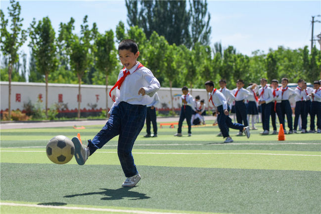 在新疆喀什地区疏附县托克扎克镇中心小学,学生们在上体育课(2022年6月10日摄)。新华社记者 丁磊 摄