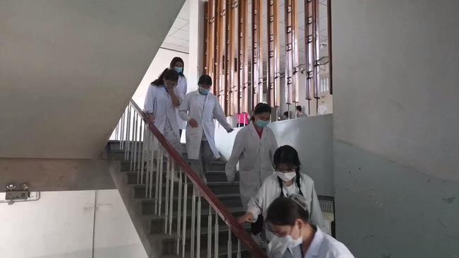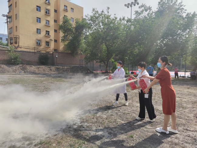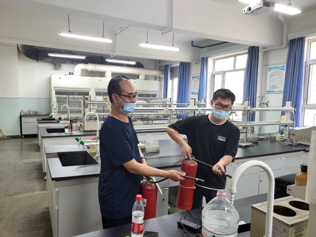 会后,参会人员来到昆仑校区化学楼,在保卫处、实验室与设备管理处、派出所、化学化工学院等各部门配合下,由王媛现场指导,在化学楼实验室开展了一次发生危险事故的紧急撤离演练,化学化工学院师生模拟体验从火灾发生到疏散撤离的全过程。最后,王媛为师生详细讲解干粉灭火器的构造、使用方法和注意事项,并指导师生在体育场空地进行了灭火实操演练。