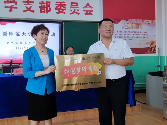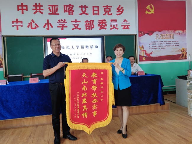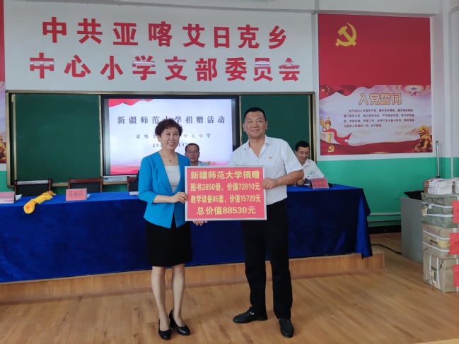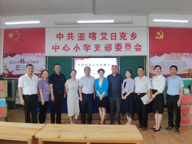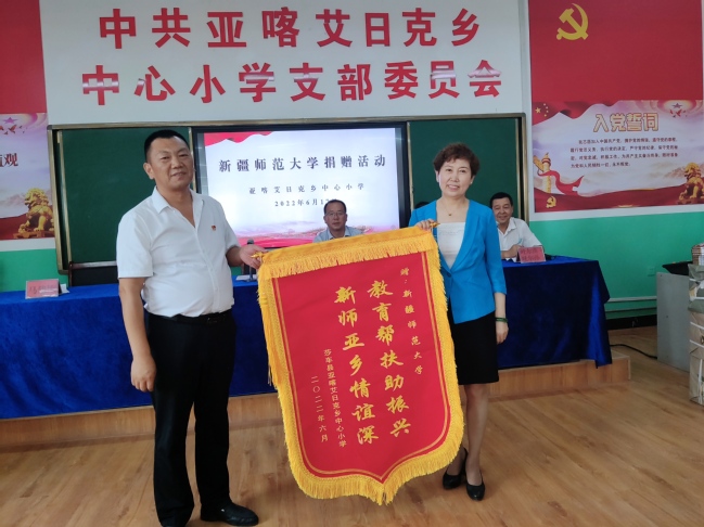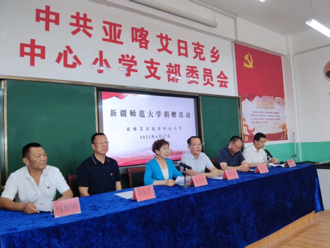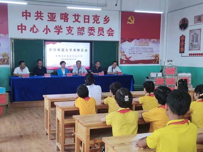 按照学校党委工作部署,为扎实推进对莎车县亚喀艾日克乡中心小学的教育帮扶工作,改善其办学条件、优化教学管理体制机制、提高办学质量和办学水平,6月17日,我校向亚喀艾日克乡中心小学捐赠仪式在乡中心小学举行。校党委常委、副校长、驻莎车县前方党工委书记孙秀玲出席捐赠仪式并讲话,莎车县委常委、宣传部部长、教育工委书记陈保云,莎车县教育局党委书记、副局长陈海洋,亚喀艾日克乡党委书记梁秀超,亚喀艾日克乡中心小学党支部书记马建刚,校长吐尔洪江·图尔孙,莎车县教育局干部、附属中学送教教师和部分工作队队员等参加仪式。捐赠仪式由吐尔洪江·图尔孙主持。