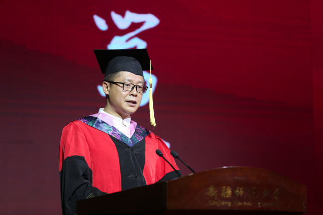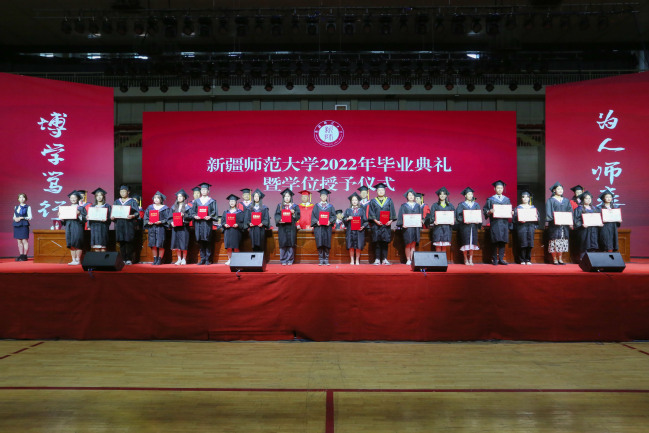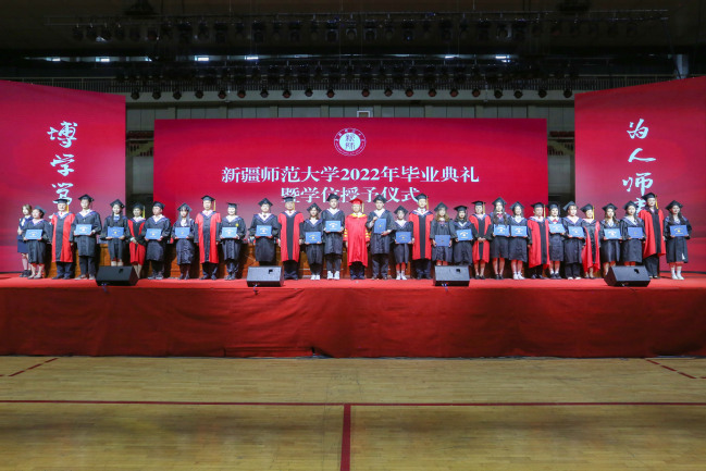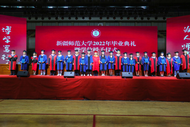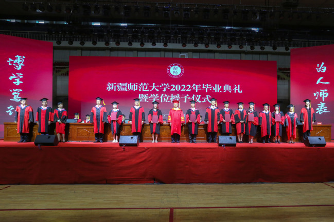 6月6日下午,新疆师范大学2022年毕业典礼暨学位授予仪式在我校昆仑校区体育馆隆重举行。校党委书记葛国,党委副书记、副校长于祥成,党委常委、副校长王晓峰,副校长古丽帕丽·阿不都拉,党委常委、副校长李魁铭,党委常委、纪委书记王志勇,党委常委、副校长孙秀玲,党委常委、副校长季荣,党委常委、宣传部部长高靖,党委常委、组织部部长李建荣出席典礼,学校学位委员会委员、相关职能部门领导、各学院领导、硕博导师代表、全体辅导员、学业班主任代表、2022届全体毕业生参加典礼。典礼由校党委副书记、副校长于祥成主持。