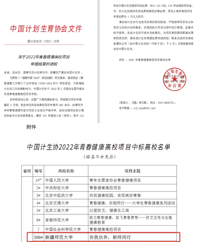 近日,中国计划生育协会发布《关于2022年青春健康高校项目申报结果的通知》(国计生协〔2022〕19号),我校心理学院与心理气象站学生社团共同申报的“你我伙伴,新师同行”项目从500余份高校项目中脱颖而出,成功入选2022年青春健康高校项目,成为155所由中国计划生育协会提供项目经费的A类项目高校之一。