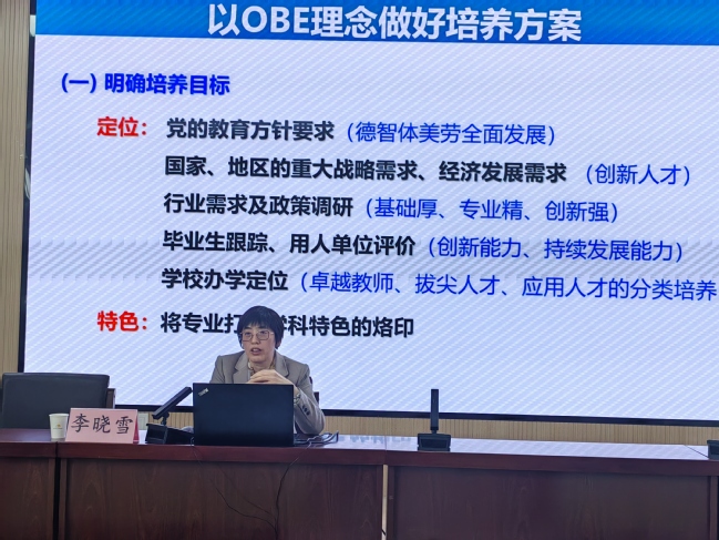 会上,教务处(教学质量监测与评估中心)主任李晓雪以“新一轮本科教育教学审核评估和师范专业认证背景下如何开展专业建设”为题进行专题培训,详细分析了审核评估与专业认证的内在联系、如何以OBE理念推进专业建设及如何保障教学质量,并就以OBE理念设计培养方案、修订教学大纲、推进课程建设等方面提出了建议,为学院的迎评自建工作提供了宝贵经验。路俊哲对学院教学管理团队老师的付出表示肯定,并介绍了近期和下学期本科教学的重点工作。