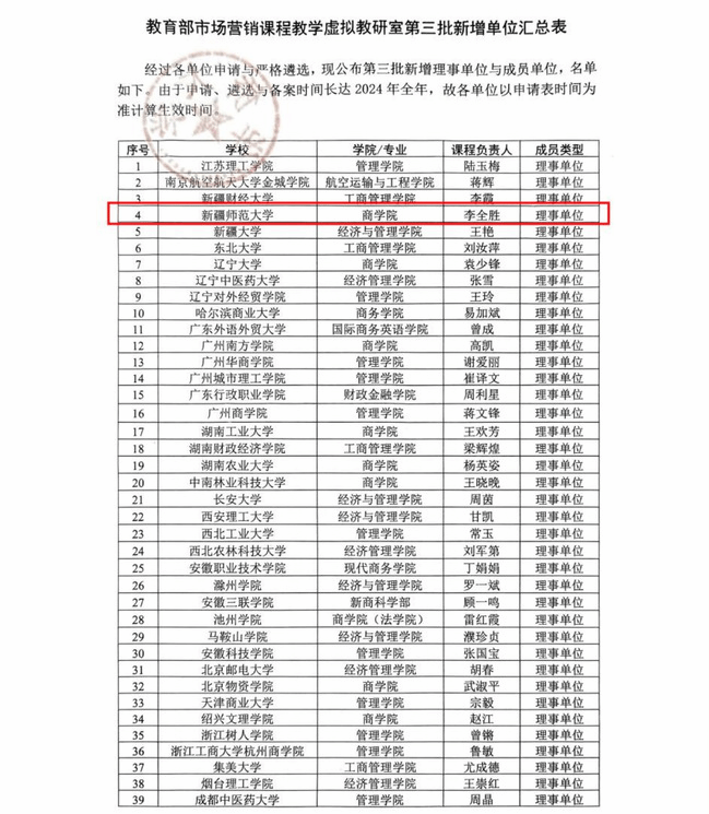 近日,教育部市场营销课程教学虚拟教研室正式公布了第三批理事单位名单,我校商学院经申报遴选成功入选,课程负责人为商学院院长李全胜。